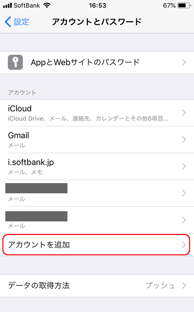 「アカウントとパスワード」画面が表示されるので、画面下にある「アカウントを追加」をタップ。